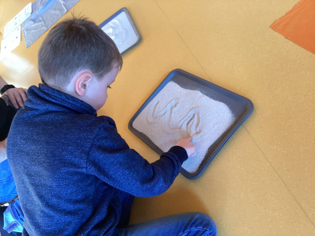 Die Silben wurden nicht nur geklatscht sondern auch die Silbenbögen in Sand gemalt. Lernen mit allen Sinnen.
