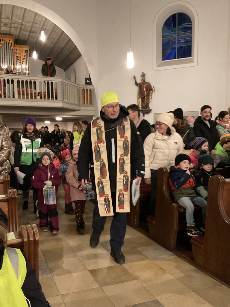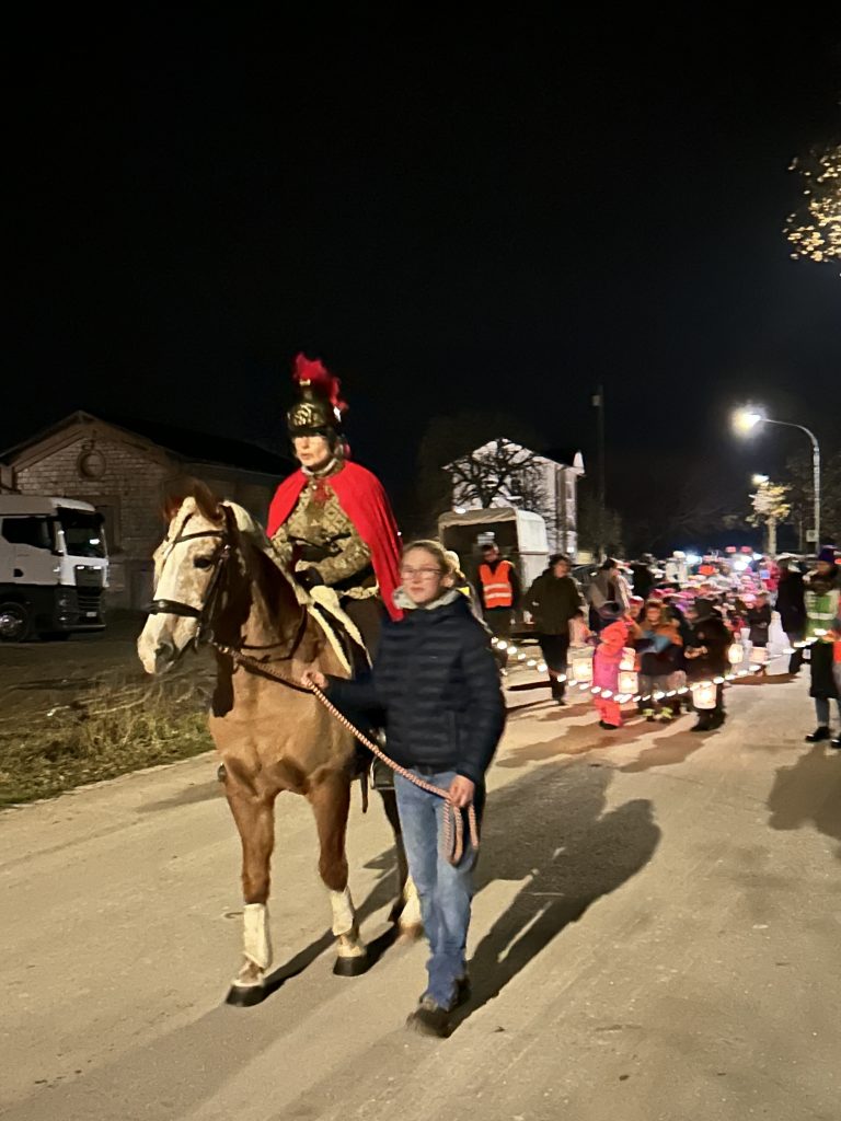 Nach dem Gottesdienst, bei dem die Vorschulkinder lauthals ihr Lieblingslied „Wir ziehen heut mit Laternen durch das Dorf“ sangen, zog ein beeindruckender Zug durch Seubersdorf. Angeführt von Martin auf dem Pferd und begleitet von der Jugendblaskapelle.